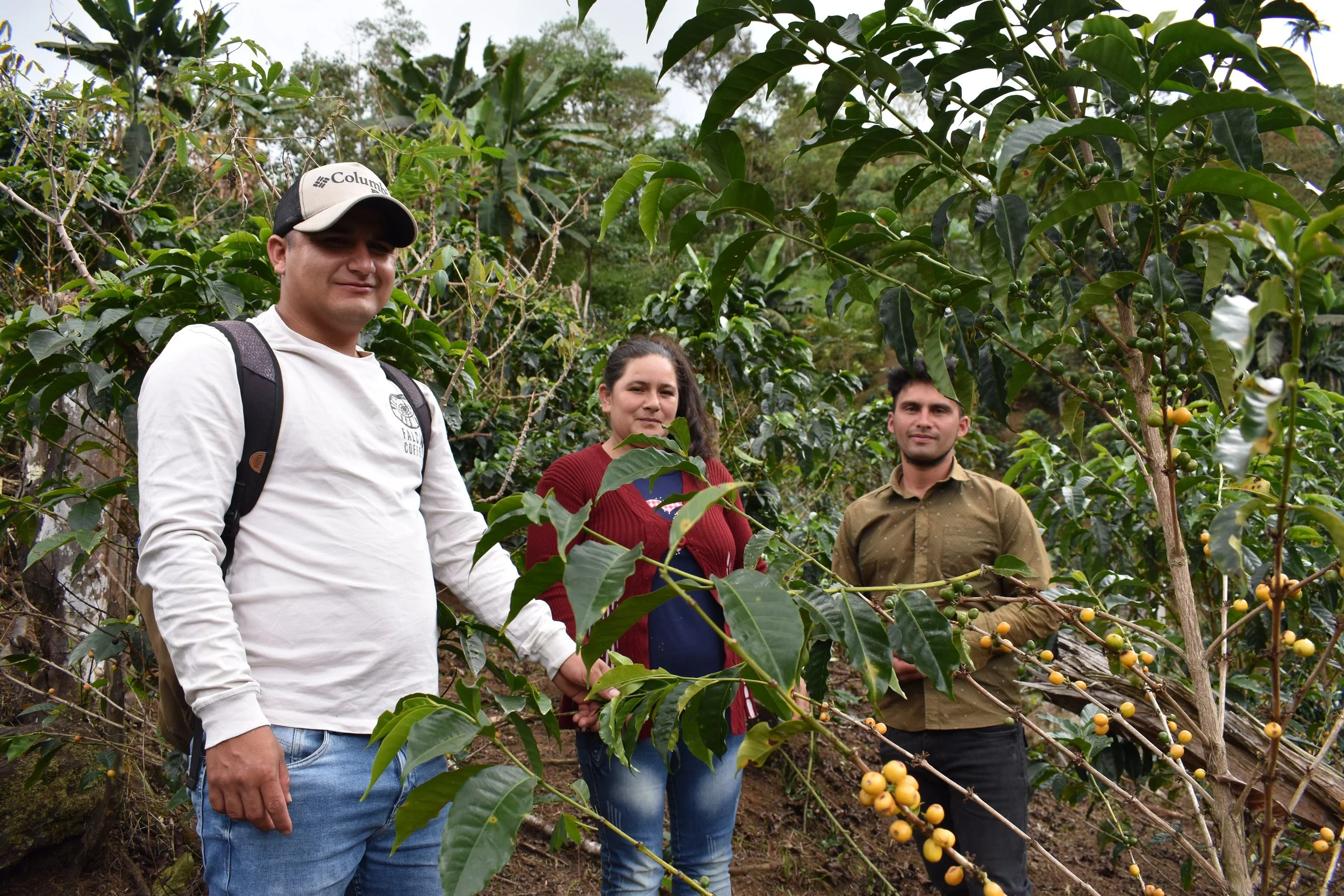 Emma (middle), her husband (on the right) and Franklin (agronomer employed by Falcon Coffees to help with support and training for growers in this area as part of their “Speciality Plus” quality improvements programme.
